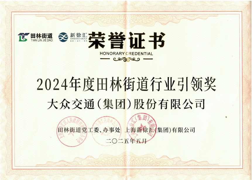 正规配资线上炒股门户 大众交通集团获颁“2024年度田林街道行业引领奖”