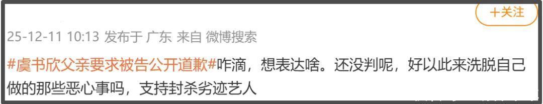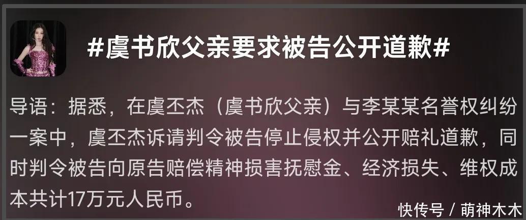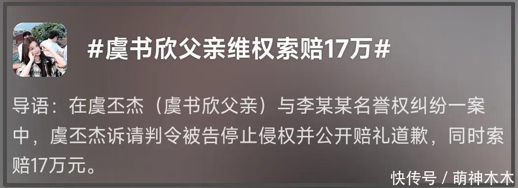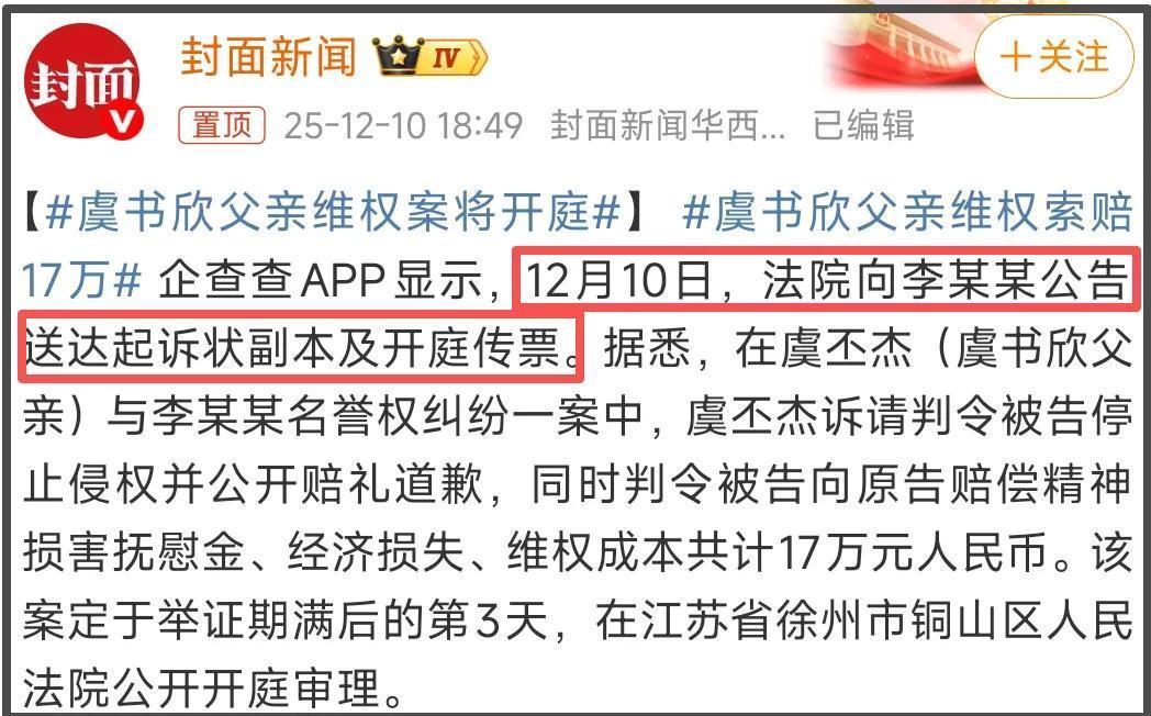 耐人寻味的是,网传空降的日子,也就是10号,虞书欣的爸爸上热搜了,热搜话题分别是“虞书欣父亲维权索赔17万”和“虞书欣父亲要求被告公开道歉”。看话题像是案子审理结束了,其实是案子刚开始,新闻上明明白白地写着“12月10日,法院向李某某公告送达起诉状副本及开庭传票”。