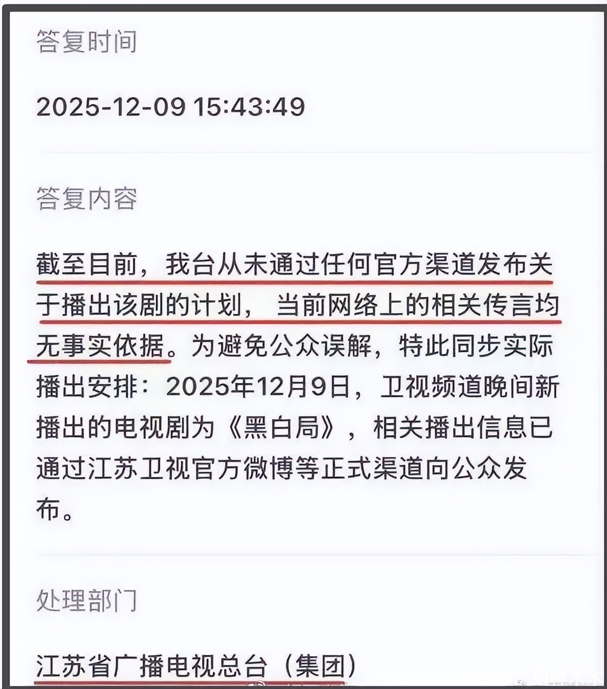 当然,这微妙的时间点还让人联想到了这两天闹得沸沸扬扬的《双轨》空降一事。一开始,是有博主爆料称《双轨》会在12月9号上星江苏卫视。可是到了9号却没出现,反而等到了江苏卫视对此事的回复,其表示“我台从未通过任何官方渠道发布关于播出该剧的计划,当前网络上的相关传言均无事实依据”,态度强硬地撇清了关系。